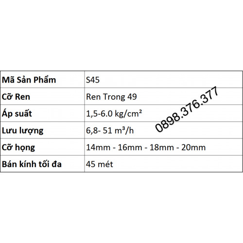 Sau đây là thông số kỹ thuật béc S45: